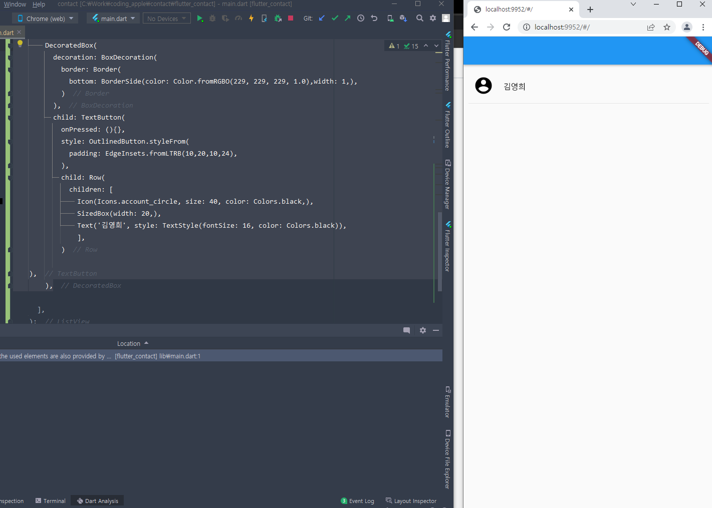 | flutter 콘솔(console)창 확인하기, DevTool 들어가기 (0) | 2022.04.16 |